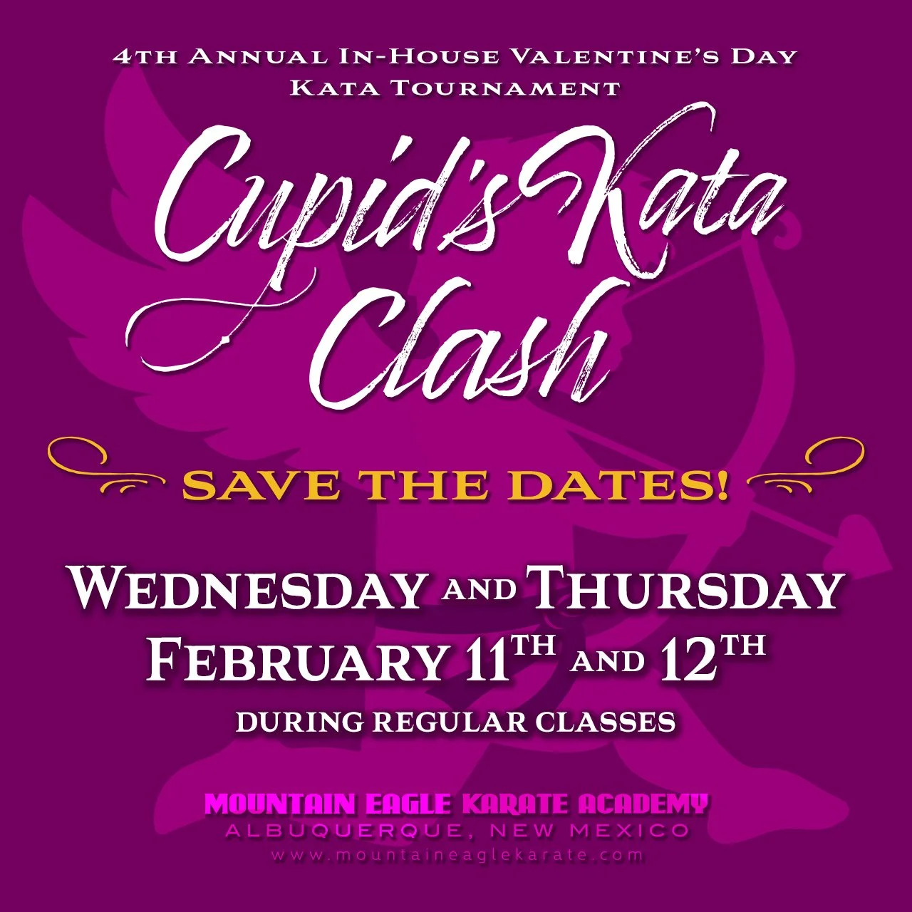 We’re excited to announce the 4th annual Cupid’s Kata Clash Tournament! This is an in-house tournament on February 11th and 12th during regular class times.